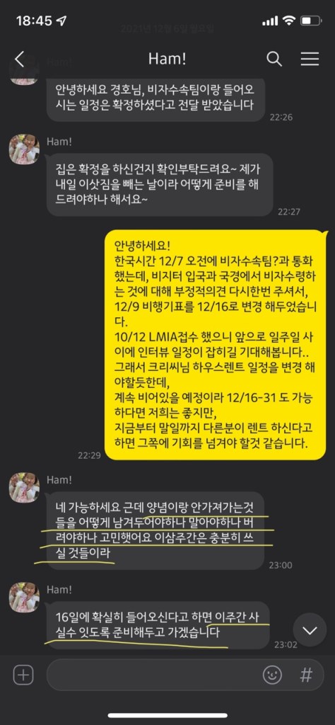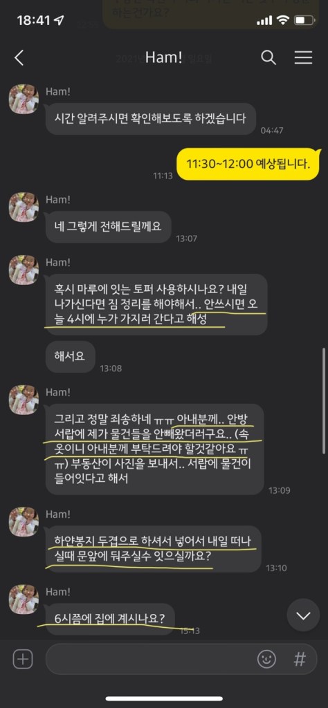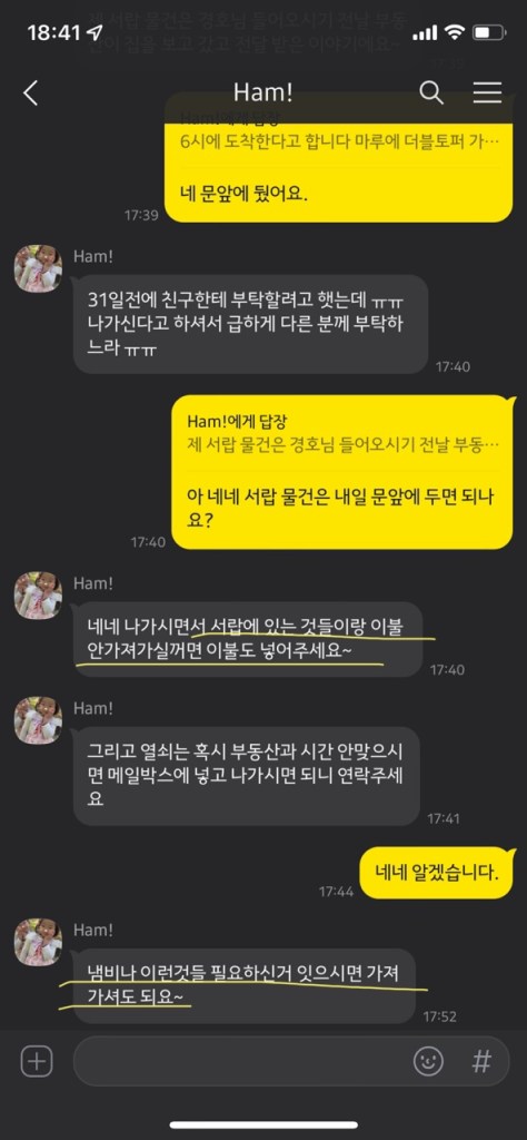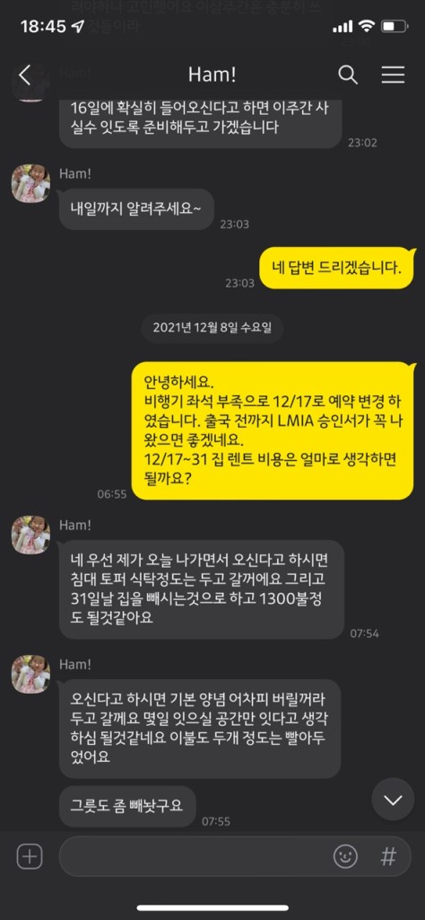 그리고 이런 얘긴 듣지 못했는데, 이 하우스에는 지하에 두 개의 룸이 있었고, 각각 룸렌트 세입자가 살고 있었다. 우리가 집 안을 걸어다니는 곳을 따라 막대기 같은 걸로 천장을 쿵쿵쿵 치고 소리도 질렀었다. 이때부터 나랑 남편은 위생에 이어 안전까지 불안을 느꼈고, 당장 내일이라도 새로운 임시숙소를 구해서 옮겨야겠다 생각했다. 더군다나 이 담당자는 쓰레기봉지를 밑에 사람들한테 전달 해주라며 심부름도 시키기 시작했다.